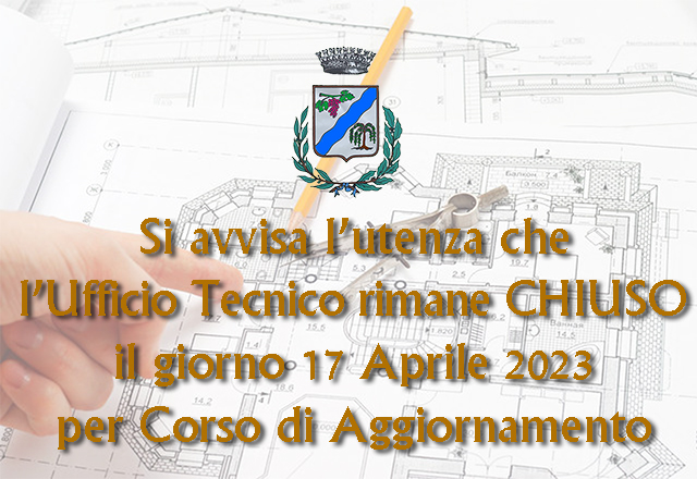 Si avvisa la gentile utenza che l’Ufficio Tecnico rimane CHIUSO il giorno 17 Aprile 2023 per Corso di Aggiornamento.